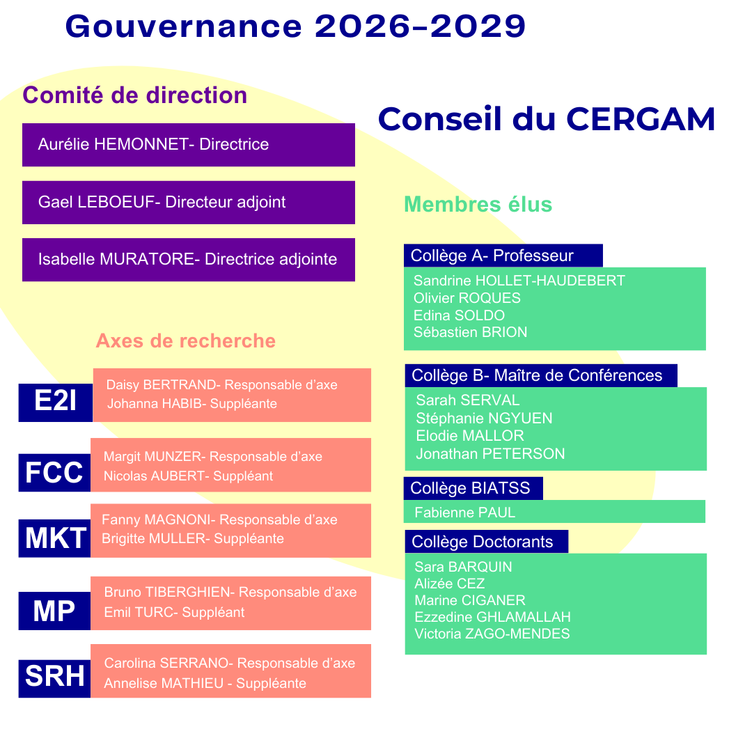 Le CERGAM est dirigé par un directeur ou une directrice, assisté(e) d’un directeur ou des directeur(s) adjoint(s) et d’une instance collégiale : le conseil de laboratoire. Le directeur/directrice prend toutes dispositions pour favoriser le développement et le rayonnement de l’unité de recherche. Il veille au bon fonctionnement scientifique, administratif et comptable du laboratoire et représente ce dernier dans les instances académiques, scientifiques et professionnelles, françaises ou étrangères.